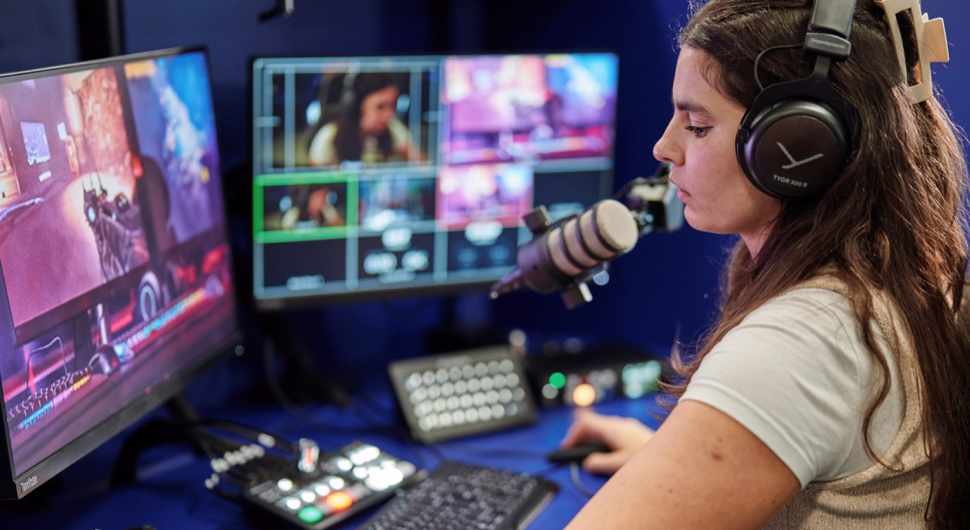 Her öğrenci iş istasyonu, çok kaynaklı canlı yapım görüntü miksajı ve ayrı kanal (ISO) kaydı için bir ATEM Mini Pro ISO etrafında kurulu. Bu görüntü mikseriyle birlikte; oyuncuyu çekmek için bir Blackmagic Micro Studio Camera 4K G2, oynatım ile grafikler için bir HyperDeck Studio HD Plus yayın cihazı, bilgisayar oyunu veya hareketli grafikler için direkt bir PC sinyali ve merkezi olarak kurulu bir Blackmagic Videohub 20x20 12G yönlendirici üzerinden yönlendirilen dördüncü bir giriş kullanılıyor.