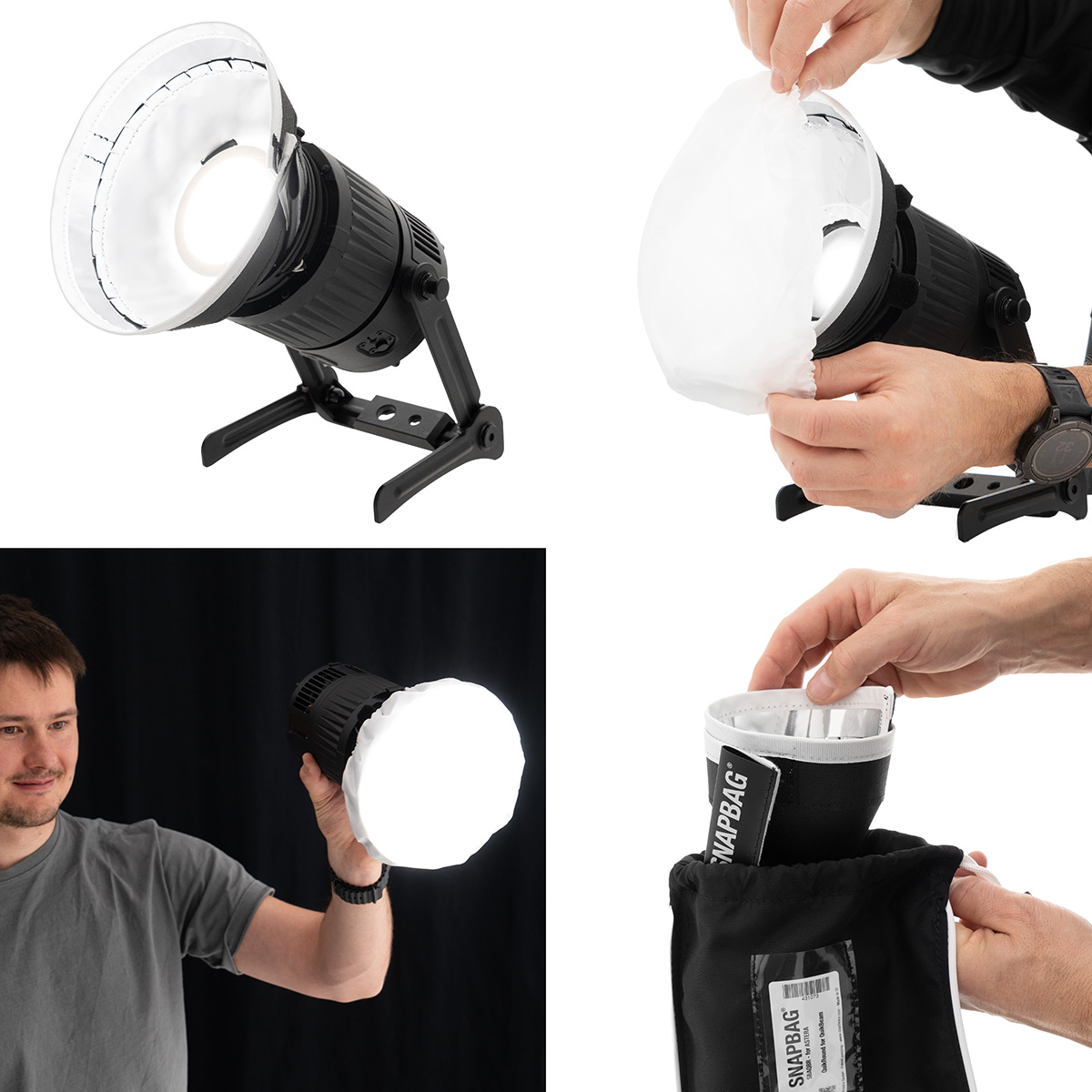 SNAPBAG® Round, esnek ışık kontrolü için birden fazla difüzyon seçeneği sunuyor. Haznenin içine monte edilen Quarter Grid Cloth bölme, ışını içten yumuşatıyor. Ürünle birlikte, kullanıcıların farklı yumuşaklık seviyelerini seçebilmeleri için değiştirilebilir duş bonesi tarzı ön difüzyonlar olan Half Grid ve SNAPCLOTH dahildir. Maksimum yoğunluk ve daha doğrudan bir görünüm için, ünite difüzyon olmadan açık yüz olarak da kullanılabilir.